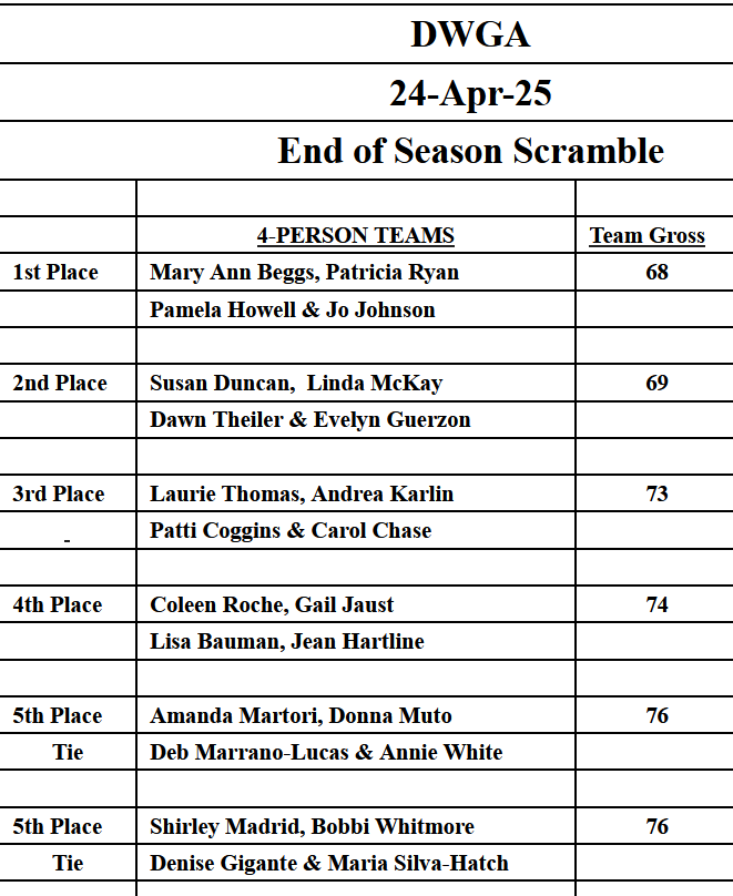 Now that our season has come to an end, we would like to thank all the committee members from this past season. Thank you, Andrea Karlin, Denise Gigante, Susan Duncan, Sally Soutter & Susan Koon for all your help in handling the league. It was a Team effort each week organizing everything for the ladies and making the league a success. We would also like to thank the staff at Duran for everything they do for our league, especially Jeff Turner, Dottie, Wes, Alex Romanoff, Johnnie Young, and the restaurant and bar staff.